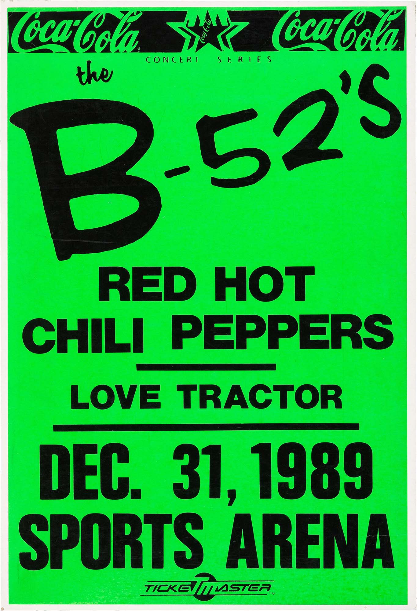 This original 1989 poster was created to advertise The B-52's alongside Red Hot Chili Peppers, performing on Sunday, 31st December 1989 at the Los Angeles Memorial Sports Arena.